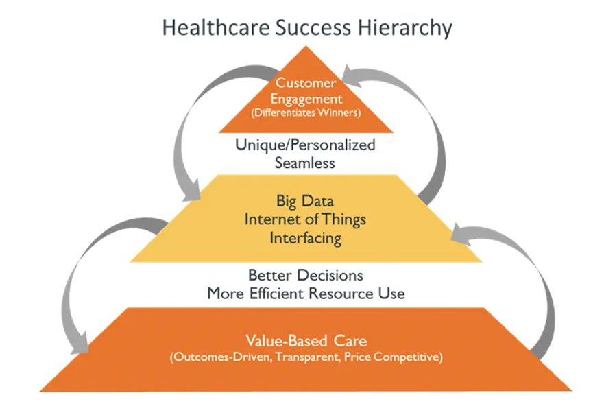 With a powerful network clinicians can focus on the latest, consolidated clinical data which are relevant to a specific encounter. By injecting concise clinical views into workflows more quickly, clinicians are able to spend more time caring and less time searching. Cain Brothers consider data in their Healthcare Success Hierarchy (see image above) and state, "The best way to think about data is to picture it as the middle layer in a three-part hierarchy that depicts the climb between care delivery and customer engagement."